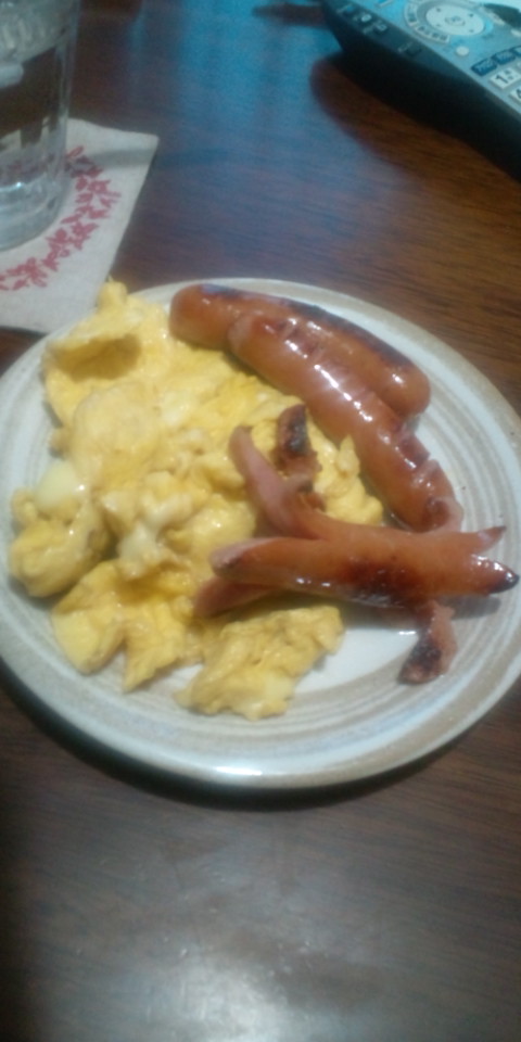 むとさん手作りオムレツとカニさんウィンナー。